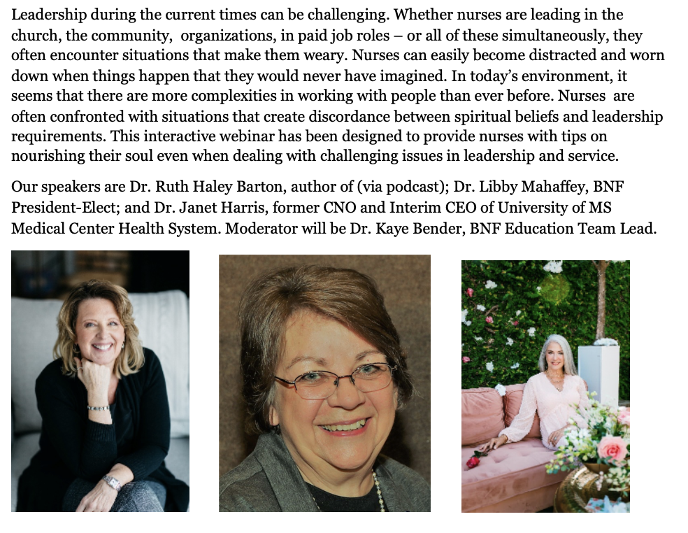 BNF Continuing Education Webinar-“Nourishing Your Soul as You Lead” Thursday, May 14, 2026 7:30 PM 8:30 PM Google Calendar ICS Register Here